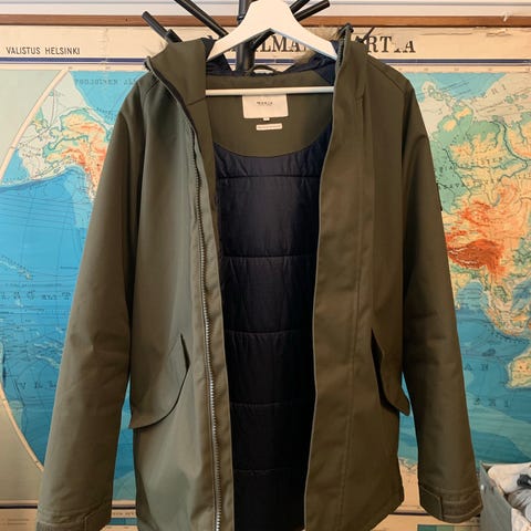 Makia miesten talvitakki kokoa S. Vihreä, polveen ulottuva. Takissa on edessä vetoketju ja painonapit, suuret etutaskut sekä säädettävä huppu, jossa tekoturkisreunus. Hihassa on Makia-logomerkki. Kuuluu talvikäyttöön vaikka uusi yksi nappi irtonut mutta vara nappi on tallessa.
