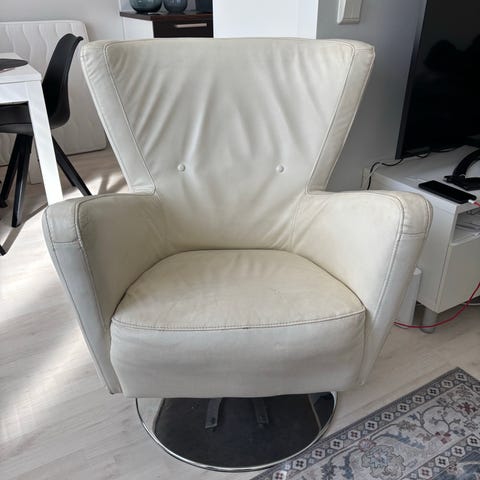 Myydään nahkainen nojatuoli keinumekanismilla. Ruskea. Siistikuntoinen. Pientä kulumaa nahkassa mutta oikeanlaisella hoitoaineella varmasti korjaantuu. Istuintyyny napakka. Kaikinpuolin hieno ja hyvä.