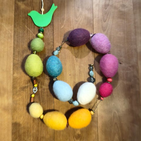 Huovutetuista munista, helmistä ja muista koruista koottu ripustettava koriste, joka vie vähän tilaa ja mahtuu melkein minne vain. Kaunis ja erilainen pääsiäiskoriste käsityötä. Nauhan pituus 130 cm. Vain yksi kappale. Myös nouto onnistuu.