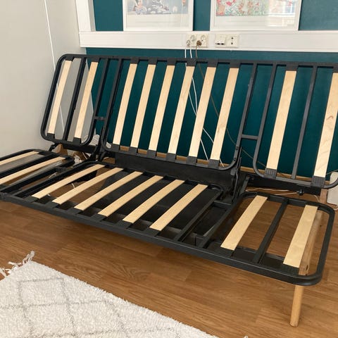 Rempan alta myyntiin: näppärä futon sohvasängyn runko 140 cm. Helppo mekanismi, ollut käytössä sekä sänkynä että sohvana. Pohjassa on värjäymää, ei näy käytössä. Runko on käsittelemätöntä puuta.