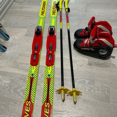 Tästä lapselle hyväkuntoinen hiihtopaketti. Madshus sukset 110cm, sauvat 80cm ja monot 29 kokoa.