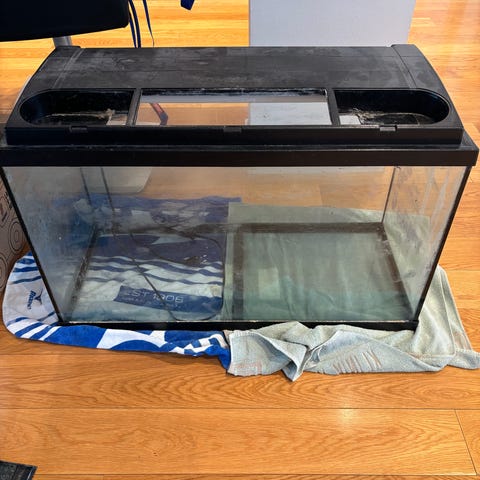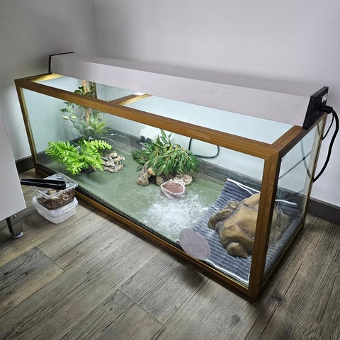 Lasinen akvaario, jossa hopeisen värinen kehys. Käytetty hyppyhämähäkin kotina, joten vedenkestävyydestä ei ole tietoa.