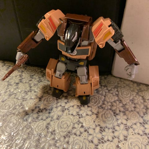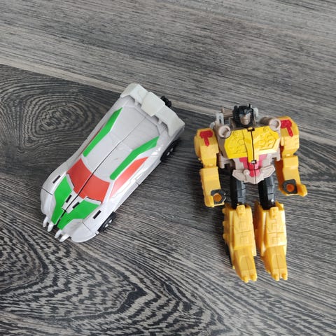 Transformers lelu, joka muuntuu valkoisesta kilpa-autosta robotiksi. Autossa ja robotissa on vihreitä ja punaisia yksityiskohtia sekä mustat renkaat. Koko n. 11cm.