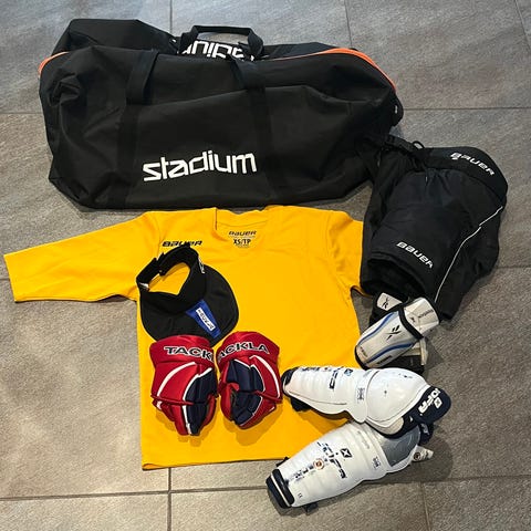 Bauer lasten jääkiekkovarustesetti laukulla. Settiin kuuluu Bauer-jääkiekkolaukku, Bauer-olkapanssarit (Youth-koko), Bauer-kaulasuoja,/säärisuojien päälliset,sekä polvi/säärisuojat mailan lavan teippiä ja luistin suojat sekä jääkiekkohousut. Varusteet soveltuvat lasten jääkiekkoharjoitteluun ja -peleihin. Kaikki osat ovat merkkivalmistajan jääkiekkovarusteita