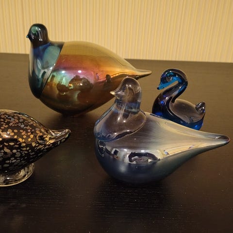 Kotimainen studiolasin valmistama lasilintu. Pituus noin 20cm täyttä lasia, painava.