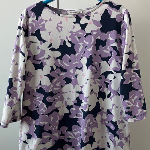 Marimekon Sokeri pusero/tunika, plyysi 80% puuvillaa, 20% polyesteria, koko on reilu L.