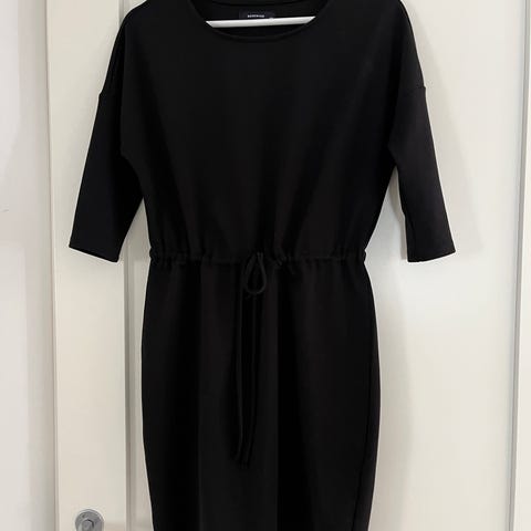 Anna Field arkimekko naisille, koko XS. Musta, yksivärinen mekko, jossa on elastaania sisältävä joustava materiaali. Puolipitkät hihat ja suoraviivainen malli. Sopii arkeen ja siistimpään pukeutumiseen.