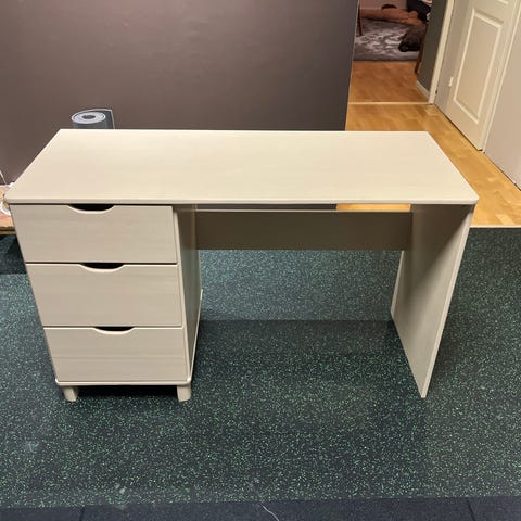Erittäin paljon käytön jälkiä omaava ikean Micke-työpöytä yläosalla. Laatikot ja saranat ehjät ja kaikki hyllyt ja pidikkeet tallella. Vaatii korjausta.