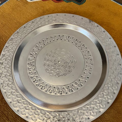 Upea, aito itämainen setti, johon kuuluu kannu, 6 pikaria ja tarjotin. Värinä messinki, jossa punainen ja siniset koristeet.
