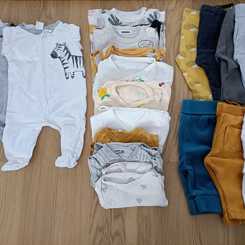 Kolme yläosaa ja yksi terällinen unihaalari. Paidan koko 70. Minusta hieman pientä koko, joten menee varmasti 62/68.