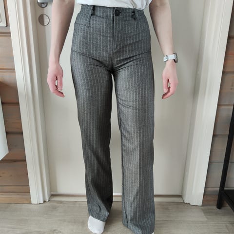 Käyttämättömät, mutta ryppyiset, koska taitos ei ollut tehty kunnolla. H&M:n naisten housut, koko 34. Harmaat, kangasta hillityllä ruutukuviolla. Housuissa on vyölenkit vyötäröllä ja vetoketju- ja hakaskiinnitys edessä. Sopivat arkikäyttöön ja toimistolle.