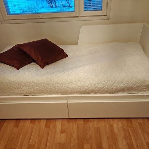Ikean brimnes sohvasänky lapsen käytöstä joten jonkun verran käytönjälkeä. Pahin tuo oikean yläreunan vekki joka nyt liimattuna (kuvassa auki) Laatikoiden vetimet vaihdettu nahkaisiin lenkkeihin, alkuperäisiä vetimiä ei enää ole. Sälepohjan jokunen kiinnitysnipu puuttuu mutta ei ole meillä vaikuttanut käyttöön, uusia saa ikeast ilmaiseksi tilattua :)