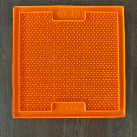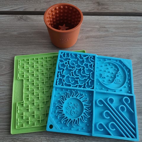 LickiMat Buddy nuolumatto koiralle. Vihreä, 20x20 cm matto, jossa on kohokuvioitu pinta ruoka- tai herkkujen levittämistä varten. Soveltuu koirille virikkeeksi ja rauhoittumiseen sekä hitaan syömisen tukemiseen. Valmistettu joustavasta materiaalista, helppo puhdistaa käsin huuhtelemalla. Muutaman kerran käytetty.