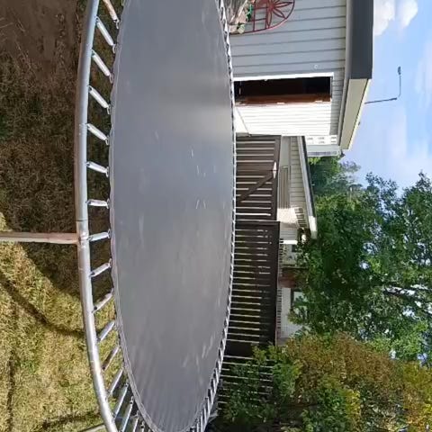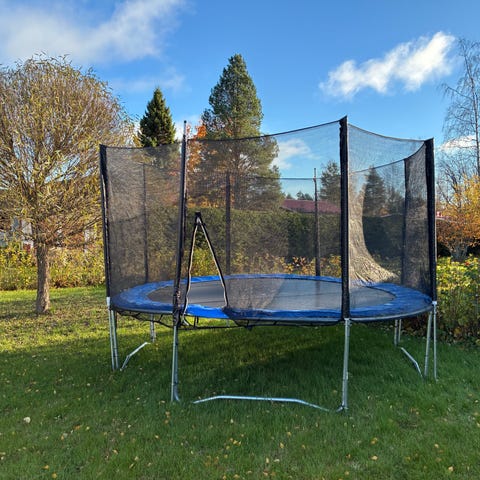 Viime kesänä ostettu tramppa turvaverkkoineen päivineen etsis uusia pomppijoita tulevalle kesälle.