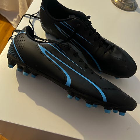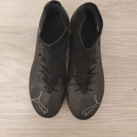 Puma jalkapallokengät, nappulapohjaiset kengät nurmikentälle. Väritys musta–oranssi, päällinen synteettistä materiaalia. Nauhakiinnitys ja matala varsi. Soveltuvat jalkapallon pelaamiseen ulkokentillä. Ostettu käytettynä.