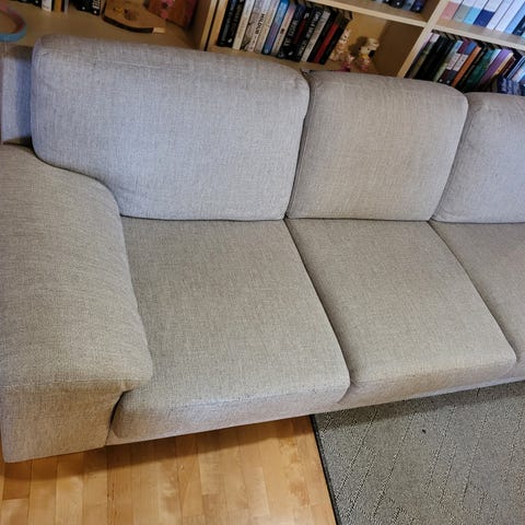Kulmadivaani, jossa okrankeltainen samettimainen kangasverhoilu ja tummat jalat. Sohvassa on L-mallinen kulmarakenne, selkänojissa nappitikkaukset ja irrotettavat istuintyynyt. Sopii useamman henkilön oleskeluun olohuoneessa. Istuinosa ja selkänoja muodostuvat useista pehmustetuista osista, ja sohva on suunniteltu sijoitettavaksi huoneen nurkkaan.Ollut käytössä puoli vuotta. Ei mahdu nykyiseen asuntoon.Ostettu Kaluste-Matilta Kajaanista ( 1600e) v.2024.