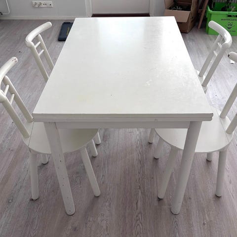 Pinnassa ja jaloissa jo hieman kulumaa, mutta muuten todella tukeva ja toimiva pöytä, jonka ääreen mahtuu helposti 6-8 ruokailijaa.
