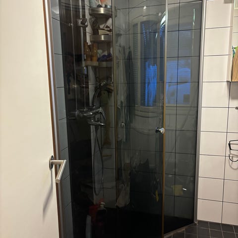 Suunniteltu asennettavaksi kylpyhuoneen nurkkaan. Kaarevat lasiseinät.