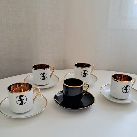 Arabian OC-mallin koboltinsiniset mokkakupit alulautasella. Kultaiset reunat ehjät, mutta yhdessä kupissa pieni särö. Tämä kuvattu erikseen