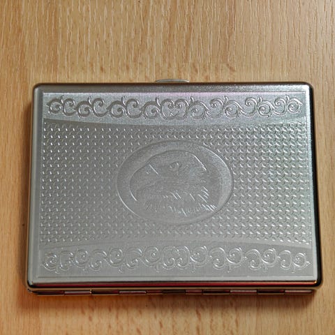 Metallinen savukerasia, hopeanvärinen ulkopinta ja sisäpuolella kuparinsävyinen viimeistely. Rasiassa on kaksi joustavaa nauhaa savukkeiden tai muiden litteiden esineiden paikallaan pitämiseen. Sopii esimerkiksi savukkeiden, korttien tai pienten paperien säilyttämiseen ja kuljettamiseen.
