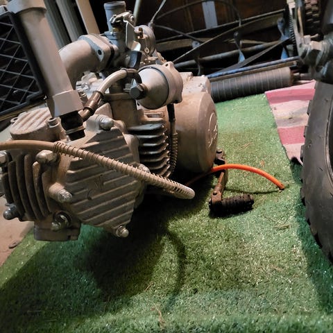 Hyvää osaa mm 8 reikäiset leveät vanteet.Usd keula yms. Kaksi 50 kuutioista moottoria mukaan. Ruisku moottorin toiminnasta ei tietoa mutta kaasari kone pitäisi toimia