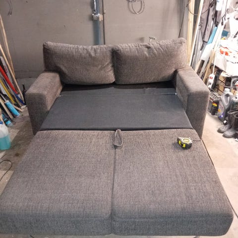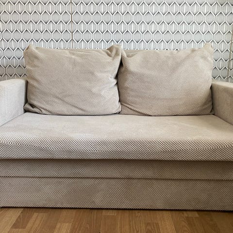 Belianilta 2 vuotta sitten ostettu vuodesohva, joka ollut vierashuoneessa vähäisellä käytöllä. Puukuvioidut metallijalat. Kun sohvan avaa vuodekäyttöön niin selkänojassa oleva puutappi ei osu toisessa jalassa olevaan koloseen. Tämä ei haittaa käytössä lainkaan, asettuu silti tasaisesti (näkyy kuvassa).