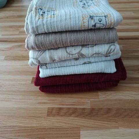 7kpl harsoja, joista 5kpl uusia. Kahdessä hyvä käytetty kunto, hajusteeton pesu.