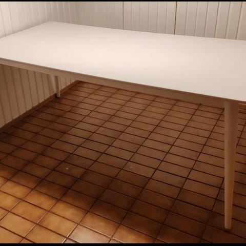 Tukeva kokopuinen ruokapöytä, jonka pinnassa paljon jälkiä, mutta yleisilme kohtalaisen siisti. Tuolit tukevat, mutta yläreunat useassa heiluu tai on irti tai on jo korjattu. Pöytä 180cm