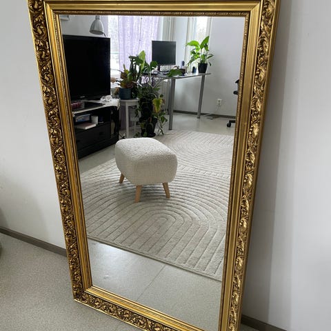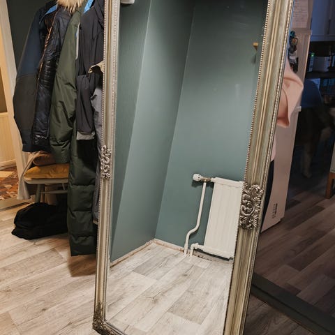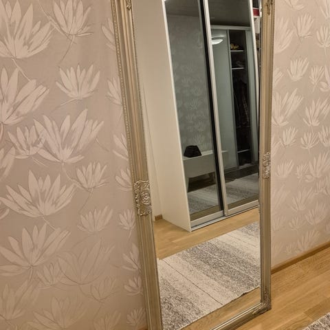 Hopeanharmaa peili. Kulmassa pieni lohkeama.