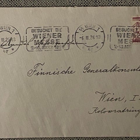 Postkarten Industrie Wien -valokuvakortti, jossa on kaupunkinäkymä Wienistä. Mustavalkoinen postikortti, etupuolella näkymä kaupungin rakennuksista, muistomerkistä ja kadusta. Kääntöpuolella käsinkirjoitettu viesti, osoitetiedot Suomeen sekä Itävallan postimerkki ja Wienin postileima vuodelta 1934. Kortti sopii esimerkiksi keräilyyn tai historiallisena dokumenttina Wienin kaupunkimaisemasta 1930-luvulta.