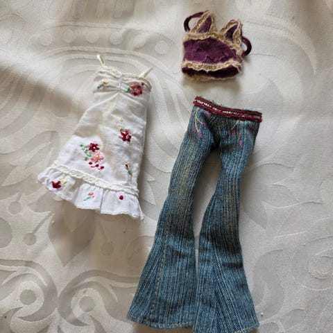 Myydään Bratz Girlz Nite Out vaatesetti. Hyväkuntoinen, katso kuvat. Vaaleansinisten housujen kimalle osittain irronnut ja pieni kellertävä tahra takapuolella toisessa lahkeessa.