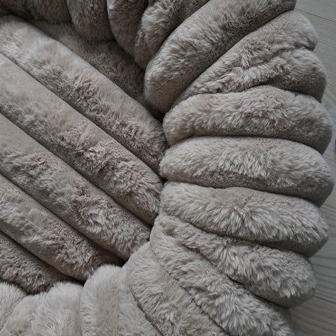 Donitsimallinen peti, jossa pehmeä, irrotettava sisätyyny. Ulkoreuna on ruskea ja tyyny vaalea, karvamainen materiaali toisella puolella ja sileä kangas toisella puolella. Pedin pohja on tummaa, liukumatonta kangasta. Koira on pari kertaa kokeillut, mutta ei kelvannut sille liian korkeiden laitojen takia.