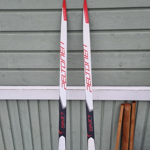 Atomic Redster Classic Skintec Jr perinteisen tyylin sukset, pituus 175 cm. Painoluokka 40-50 kg. Siteet NNN-järjestelmälle yhteensopiville monoille. Start -sauvat 130 cm.