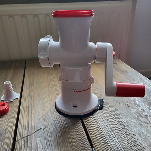 Myydään Tupperwaren Fusion -sarjan lihamylly, raastimet, mehuprässi ja kuutioterä,jolla voi kuutioida vaikka perunaa tai kasviksia tai tehdä vaikka ranskalaisia.