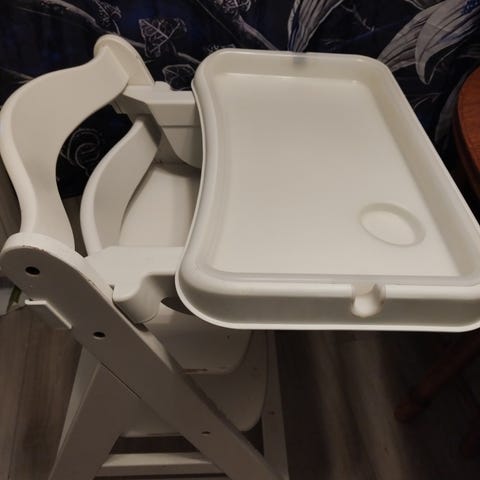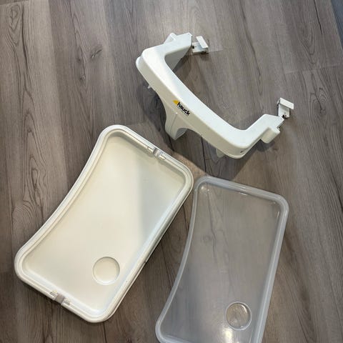 Hauck Alpha -syöttötuolin lisäosat. Kokonaisuuteen kuuluu irrotettava tarjotin ja valjaat.