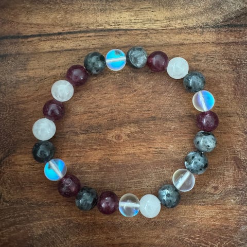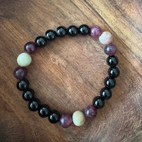 Itsetehty käyttämätön rannekoru. Sisällä kaksinkertainen kuminauha. Helmet ovat n.8mm leveitä.
