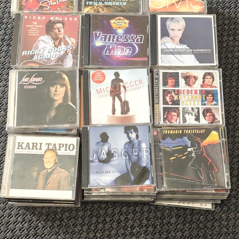 Kuvan kokoisuus kerralla. Kyseessä yli 100 kpl cd levyjä ja 5 kpl cd säilytyskukkaroita. Musiikkityyli: levyt olleet kuntosalin treenimusiikkina.