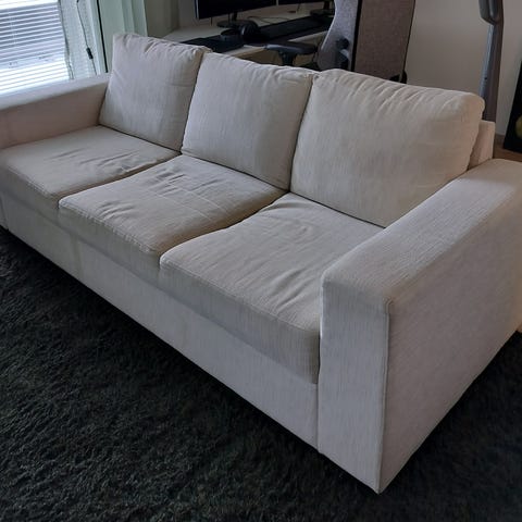 Tyylikäs sohva, joka ostettiin Maskusta kaksi vuotta sitten. Sitä käytettiin varovasti syömällä häntä kolmelta ihmiseltä. Selkänojatyynyissä ja istuintyynyissä on irrotettavat suojat. Pesin ne ennen myyntiä. Talossa ei ollut lemmikkejä tai tupakoitsijoita. Sohvasta ei ole valittamista.