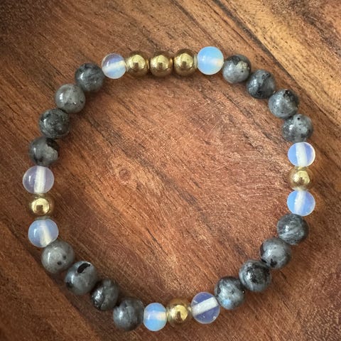 Labradoriittirannekoru, jossa opaliittia ja kultaisen värisiä helmiä