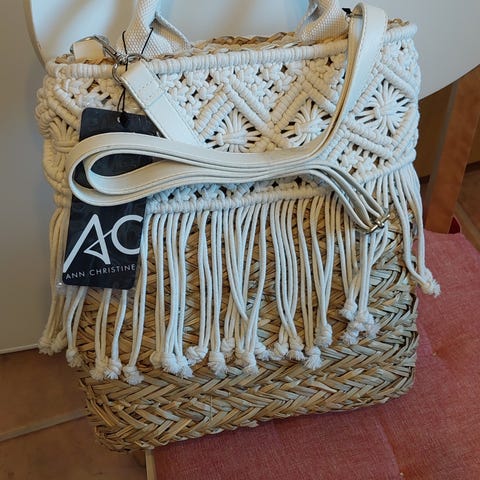 Makramee laukku farkunsininen. Ruotsalaista käsityötä (käsityöntekijän pyöreä metalli logolöytyy pidikkeestä. (En muista nimeä)