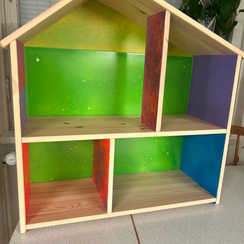 Oma valmisteinen värikäs nukkekoti. Tukeva. Mitat: leveys 57 cm, suurin korkeus 44 cm, syvyya 20 cm. Nouto Nummelasta.
