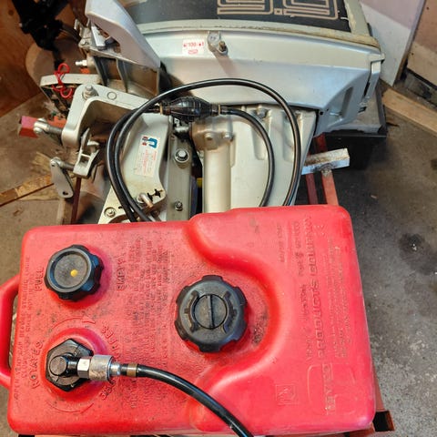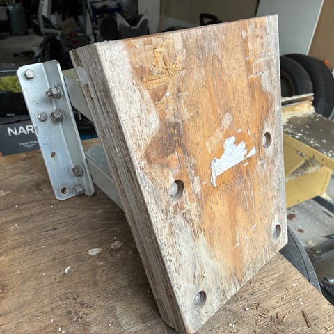 Alumiini / kevytmetalli apumoottoriteline peräpeiliin. Voi nostaa ylös likuja pitkin. Moottorikiinnitystä voi kallistaa pikkasen. Vanerit kun uusii niin uutta vastaava. Läpiruuvieilla kiinnitys. Huom pienemmille koneille. En löytäny mallia/ merkkiä