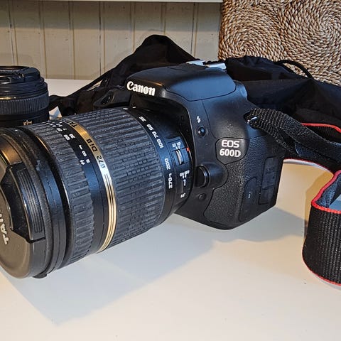 Canon EOS 600D + kaukolaukaisin, kolmijalka, kalansilmä-/makrolisälinssi, laukku