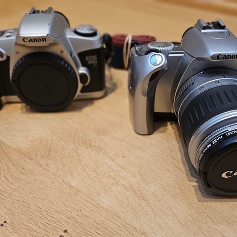 Kolme hyväkuntoista Canonin filmirunkoa.