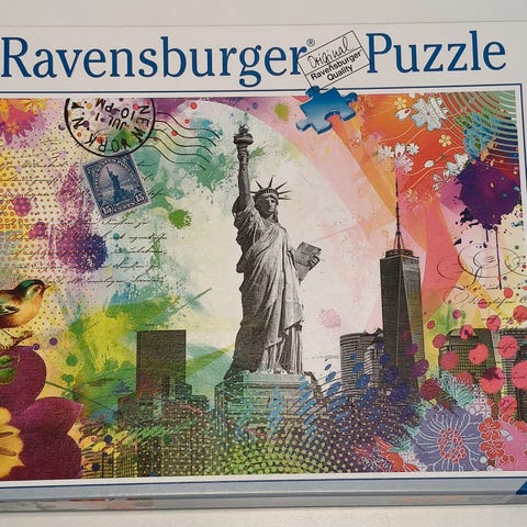 Ravensburger ja Piatnik palapelit, joissa kummassakin 1000 palaa. Yhdessä palapelissä on värikäs papukaijateema trooppisessa ympäristössä ja toisessa kaupunkinäkymä sillalta auringonlaskussa. Piatnikin palapelissä on sarjakuvamainen, humoristinen ihmisjoukkoa esittävä kuva. Sopivat kokoamiseen vapaa-ajalla ja palapeliharrastukseen.