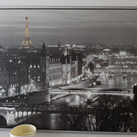 Kehystetty seinätaulu, jossa on mustavalkoinen piirros Eiffel-tornista ja puista. Taulussa on suorakaiteen muotoinen kehys ja takana ripustusvaijeri seinälle kiinnittämistä varten. Sopii sisustuselementiksi esimerkiksi olohuoneeseen, makuuhuoneeseen tai työtilaan.