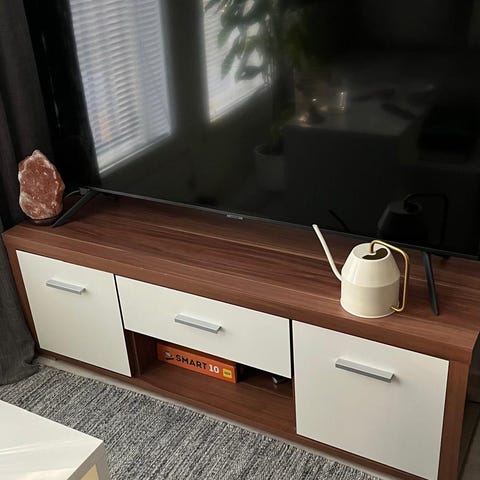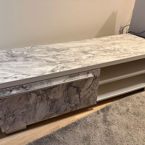 IKEA tv-taso. Valkoinen runko, edessä kaksi vetolaatikkoa, joissa mattalasiset etupaneelit ja metallivetimet (vaihdettu alkuperäisistä). Yläosassa kaksi avointa hyllyä.
