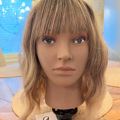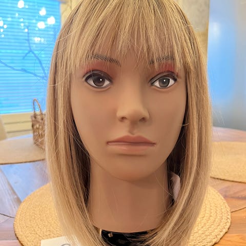 Uusi lyhyt ja vaalea, kerroksittainen hiuskuituperuukki. Peruukissa on vielä vaaleampia raitoja. Niska on pitkähkö.