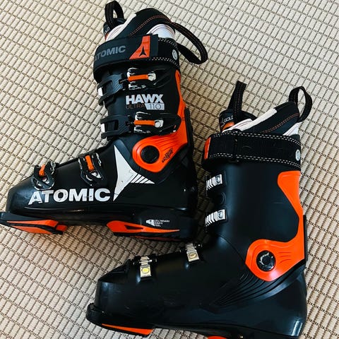 Atomic Hawx Magna 75X laskettelumonot. Kengän koko on 26/26.5 ja lestin leveys 102 mm (Wide Last). Pohjan pituus on 309 mm. Väri on musta harmailla yksityiskohdilla. Monoissa on neljä säädettävää solkea ja leveä tarrakiristys varressa. Kunto hyvä, käytönjäljet näkyy naarmuina pinnassa.