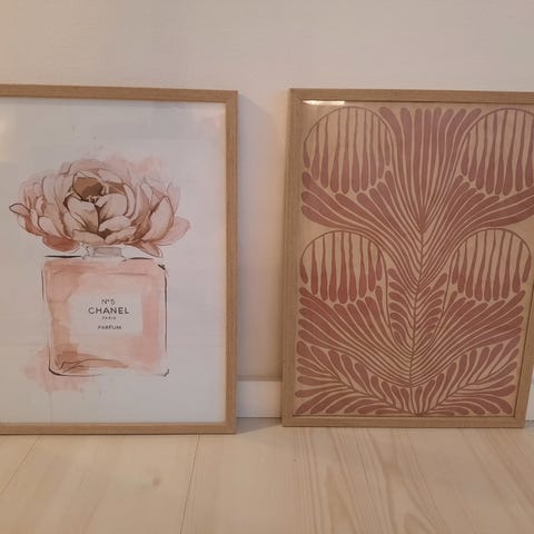 Kaksi kehystettyä taulua, joissa on kenkäaiheiset kuvitukset. Toisessa taulussa on punaiset kengät ja toisessa tummat kengät sekä punainen perhonen. Molemmissa on valkoinen kehys ja vaalea, kuviollinen tausta. Sopivat esimerkiksi sisustuselementiksi olohuoneeseen, makuuhuoneeseen tai eteiseen.